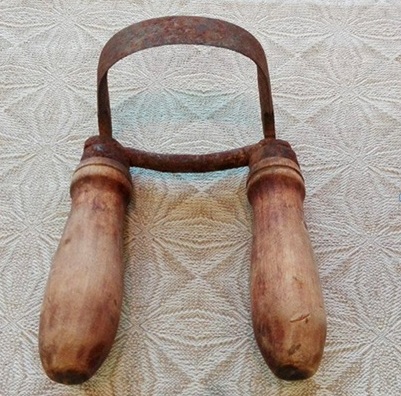No dzelzs izgatavots pusapļa grebšanas rīks ar diviem koka rokturiem abās pusēs. Izmantots abras, siles un citu priekšmetu izgrebšanai.