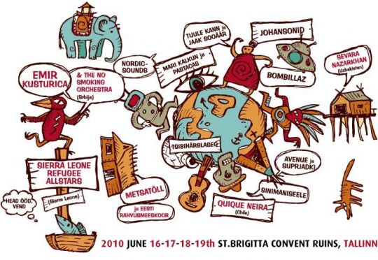 Interesants un visnotaļ kolorīts pasākums norisināsies Tallinas Sv.Brigitas pilsdrupās- Maailmakyla,kur no visas pasaules kopā sabrauc “world music” pārstāvji. Šogad būs gan serbu Emirs Kustarica ar orķestri, gan Sjerraleonas bēgļu koris, gan citi brīnumi. Domājams, šāda alternatīva patiks tiem,kuri ir mazliet noguruši no rokmūzikas trokšņa vai dejotāju tusiņiem. Norises laiks- 16.-19.jūnijs. Biļetes cena četrām dienām maksā līdz 31 latam iepriekšpārdošanā.