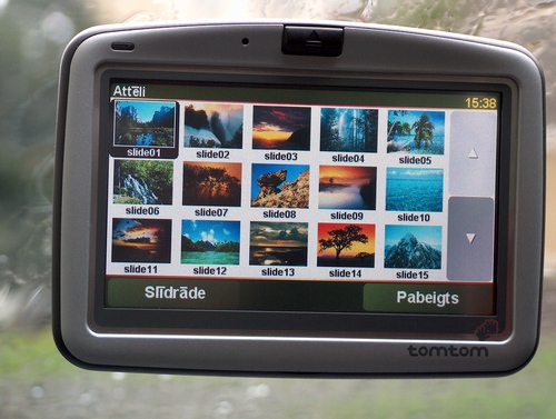 Citās valodās komandiera balsi var izvēlēties – gan dzimuma, gan tembra ziņā. Mums pagaidām aizmigt neļauj tikai un vienīgi Ivars! Katrai ierīcei sava sūtība virs zemes. Mūsu draugs TOM TOM GO 910 ir ne tikai labs padomdevējs, bet arī čakls palīgs. Tas izmantojams gan kā mobilā telefona brīvroku sistēma, gan kā MP3 atskaņotājs. Ja automobiļa audiosistēma aprīkota ar „zilzobi“, tad atliek vien sapārot šis abas ierīces un diskotēka var sākties! TOM TOM smadzenēs atvēlēta vieta arī attēlu kolekcijai. Un kāpēc gan sastrēgumā nenodoties skaistu dabasskatu apskatei? Vārdu sakot – cilvēks orķestris!