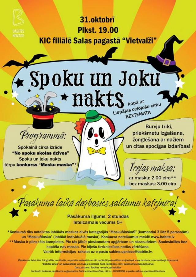 | Spoku un joku nakts “Vietvalžos” | Babītes novada pašvaldības kultūrizglītības centra filiāle “Vietvalži” |