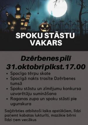 Dzērbenes tautas namā līdz 25. oktobrim spoku stāstu un zīmējumu konkurss „Mans spoku stāsts”. 31.oktobrī plkst. 17.00 Spoku stāstu vakars ar nakts trasīti, spocīgiem tērpiem un baidīšanos. Konkursa darbus iesniegt Dzērbenes tautas namā – uz A4 formāta lapas līdz 25.oktobrim. Raganas zupa un spoku stāsti pie ugunskura.