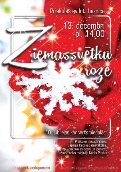 13. decembrī 14.00 Priekules ev.lut. baznīcā Ziemassvētku roze 10. jubilejas koncerts, kurā piedalās Priekules novada skolu, Liepājas Katoļu pamatskolas, Pop -rok skolas bērni un jaunieši, uzrunu teiks mācītājs Kārlis Puķītis. Ieeja pret ziedojumiem.