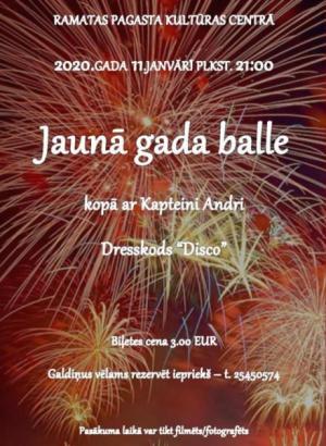 11. janvārī plkst.21.00 Ramatas pagasta Kultūras centrā Jaunā gada balle kopā ar Kapteini Andri, dresskods "Disco". Ierašanās ar groziņiem. Ieeja 3,00 euro.