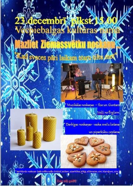 23. decembrī plkst. 15.00 Vecpiebalgas kultūras namā Ziemassvētku pasākums „Kad sveces pāri laikam staru tiltu met”: * Muzikālas noskaņas - Ilze un Guntars Velči no Ērgļiem. * Darbīgas noskaņas - vaska sveču liešana un piparkūku cepšana. * Iepirkšanās noskaņas - īpašo svētku našķu tirdziņš. Esiet mīļi gaidīti!