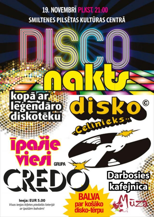 19. novembrī no plkst. 21.00 Smiltenes pilsētas Kultūras centrā gaidāma Disko nakts ar diskotēku “Ceļinieks” un leģendāro grupu “Credo”. Pasākumā – mūzika dažādām gaumēm.