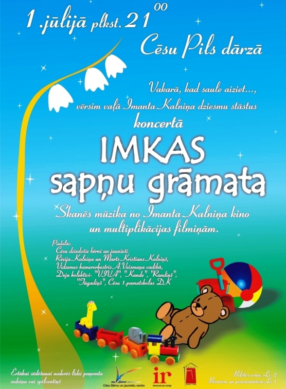 1.jūlijā Cēsis sveiks komponistu Imantu Kalniņu ar īpašu bērnu mūzikas koncertu Pils dārzā „Imkas sapņu grāmata”, kurā kopā ar Cēsu bērniem un jauniešiem muzicēs Rēzija Kalniņa un Marts Kristiāns Kalniņš. Koncerta sākums plkst.21:00