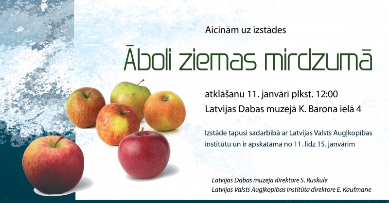 No 11. līdz 15. janvārim Latvijas Dabas muzejā būs apskatāma Latvijā audzētu ābolu izstāde „Āboli ziemas mirdzumā”. Izstāde tapusi sadarbībā ar Latvijas Valsts Augļkopības institūtu.