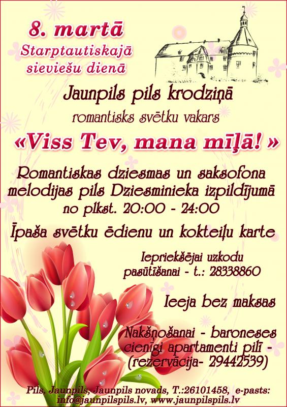 8. martā, Starptautiskajā sieviešu dienā, Jaunpils pils krodziņā romantisks svētku vakars „Viss Tev, mana mīļā!”. Romantiskas dziesmas un saksofona melodijas pils Dziesminieka izpildījumā no plkst. 20:00 - 24:00.