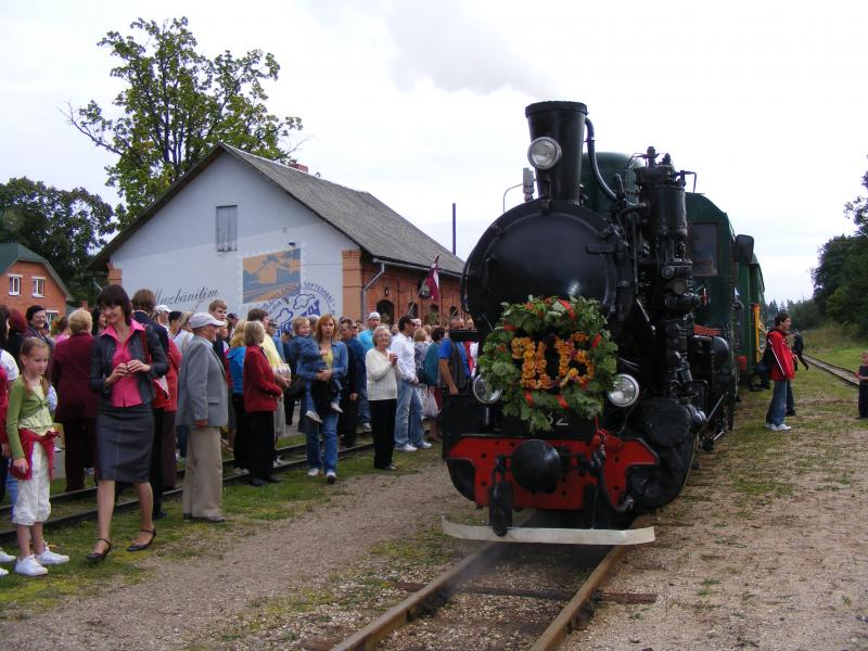 FOTO: - Alūksnes stacijā pasākuma apmeklētāji sagaida galveno svētku vaininieku – šaursliežu bānīti