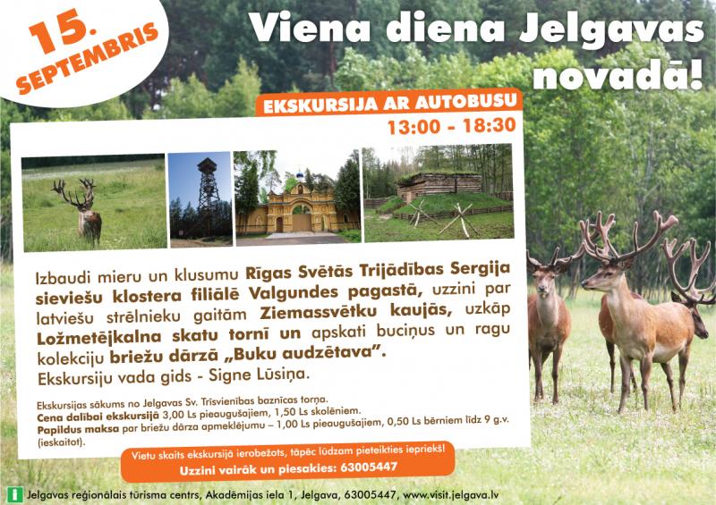 Ekskursijas sākums plkst. 13:00 pie Jelgavas Sv. Trīsvienības baznīcas torņa. Atgriešanās Jelgavā ap plkst. 18:30. Cena dalībai ekskursijā 3,00 Ls pieaugušajiem, 1,50 Ls skolēniem (cenā iekļauti transporta un gidu pakalpojumi). Papildus maksa par briežu dārza apmeklējumu – 1,00 Ls pieaugušajiem, 0,50 Ls bērniem līdz 9 g.v. (ieskaitot).