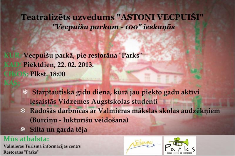 Vidusskolēniem, studentiem un citiem interesentiem. Teatralizēts uzvedums „Astoņi vecpuiši Vecpuišu parka simtgades ieskaņās”. Radošās darbnīcas kopā ar Valmieras mākslas skolas audzēkņiem (Burciņu – lukturīšu veidošana). Sākums plkst. 18:00 Vecpuišu parkā pie muzikālā restorāna „Parks”; Pasākuma ilgums ~1h. Būs silta tēja