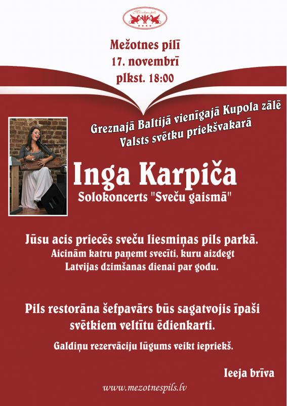 17.novembrī plkst. 18.00 Mežotnes pilī – greznajā Baltijā vienīgajā Kupola zālē Valsts svētku priekšvakarā Ingas Karpičas solo koncerts „Sveču gaismā”.