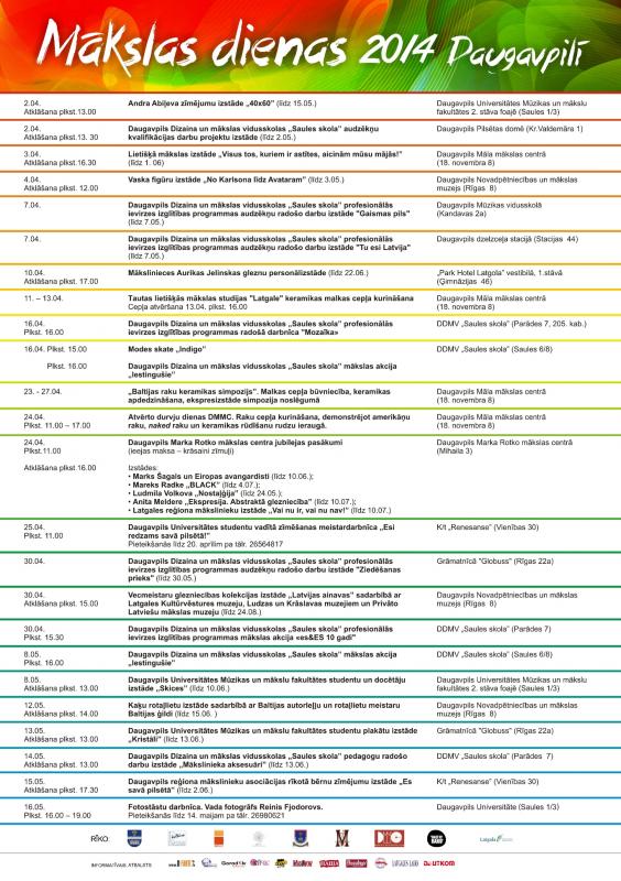 Tā, piemēram, savu kvalifikācijas darbu projektu izstādi piedāvā Daugavpils Dizaina un mākslas vidusskolas „Saules skola” audzēkņi, Daugavpils reģiona mākslinieku asociācija rīko bērnu zīmējumu izstādi „Es savā pilsētā”, Daugavpils Universitāte aicina uz Mūzikas un mākslu fakultātes studentu plakātu izstādi, savukārt Daugavpils Marka Rotko mākslas centrā no 24. aprīļa būs apskatāmas piecas izstādes, kuru vidū ir arī Marka Šagāla un Eiropas avangardistu darbu izstāde, bet no 30. aprīļa Daugavpils Novadpētniecības un mākslas muzejā (DNMM) interesentiem būs pieejama vecmeistaru glezniecības kolekcijas izstāde „Latvijas ainavas” utt.
