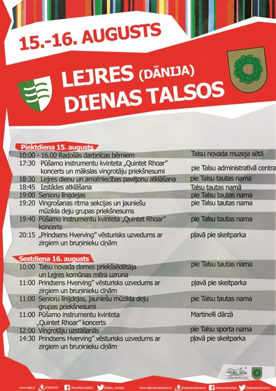 15. un 16. augustā Talsu novadā ieradīsies astoņas ārvalstu delegācijas – no Prieņiem Lietuvā, Sāremas Igaunijā, Somijas, Moldovas, Gruzijas, Turcijas, Ščolkovas Krievijā un Lejres Dānijā - lai kopā ar novada iedzīvotājiem Talsos atzīmētu Lejres dienas. Tā būs unikāla iespēja ikvienam interesentam iepazīt dāņu kultūru, tradīcijas un uzzināt ko vairāk par šīs valsts vēsturisko mantojumu, līdztekus ārvalstu viesiem atklājot arī Latvijai raksturīgo.