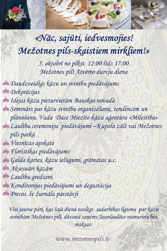 Interesentiem būs iespēja iepazīties un apskatīt Mežotnes pili kā svinību un kāzu vietu, tikties ar dažādiem kāzu un svinību pakalpojumu sniedzējiem. Dace Miezīte kāzu aģentūras „Mīlestība” direktore vadīs semināru par kāzu organizēšanu un plānošanu. Tūrisma aģentūra „Kolumbs” piedāvās izdevīgus un romantiskus piedāvājumus medusmēnesim. Bauskas novada labākie konditori aicinās degustēt dažādus konditorijas izstrādājumus. Bauskas novada tūrisma uzņēmēji stāstīs par aizraujošām kāzu pieturvietām. Uzņēmums „Geka” piedāvās kāzu atribūtu gravējumus. Precos.lv pārstāvji rādīs jaunākās tendences kāzām. Tāpat šājā dienā būs iespēja apskatīt 19. gs. stilā iekārtotos viesnīcas numuriņus.