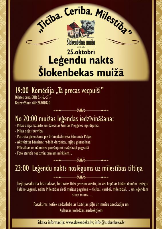 Turpinot aizsākto Leģendu nakts tradīciju, arī šogad 25. oktobrī, durvis vērs Šlokenbekas muiža. Apmeklētājiem būs iespēja izbaudīt romantisku nakti, iepazīt muižas teikas noslēpumus, kā arī iededzināt Latvijas Leģendu nakts lielāko sirdi.