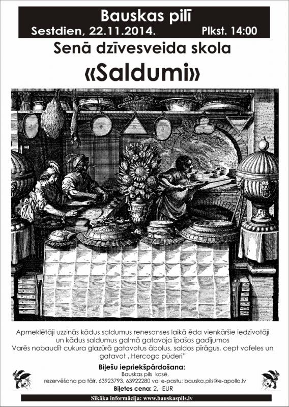 22.novembrī plkst. 14:00 Bauskas pils muzejā, Senā dzīvesveida skolas ietvaros, notiks pasākums „Saldumi”. Apmeklētāji uzzinās kādus saldumus renesanses laikā ēda vienkāršie iedzīvotāji un kādus saldumus galmā gatavoja īpašos gadījumos. Pasākuma noslēgumā apmeklētāji varēs pagatavot un nobaudīt cukura glazūrā gatavotus ābolus, saldos pīrāgus, cept vafeles un pagatavot „Hercoga pūderi”.