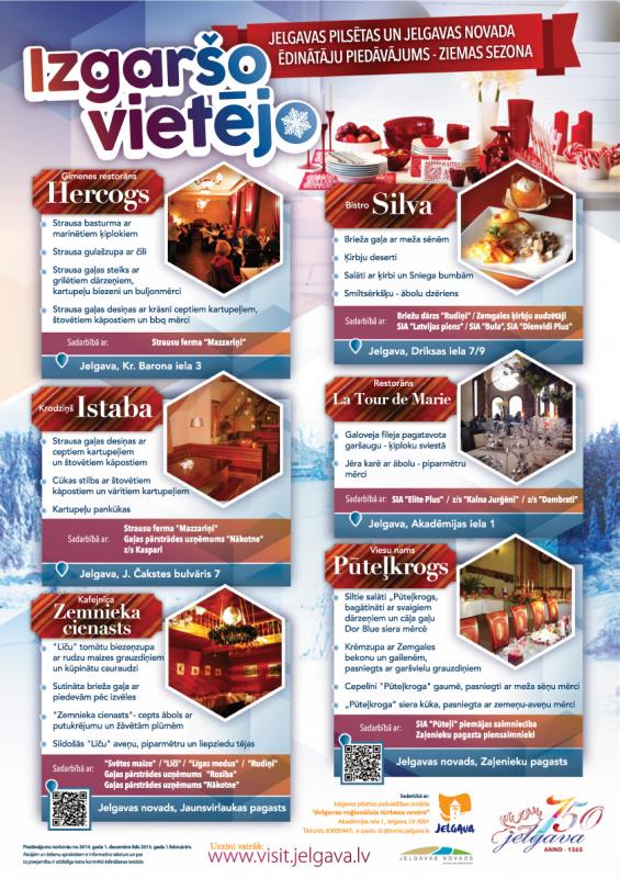 Īpašos ziemas sezonas ēdienus ir iespējams baudīt sešos ēdināšanas uzņēmumos - restorānā „La Tour de Marie” (Akadēmijas iela 1, Jelgava), bistro „Silva” (Driksas iela 7/9, Jelgava), ģimenes restorānā „Hercogs” (Kr. Barona iela 3, Jelgava), krodziņā „Istaba” (J.Čakstes bulvāris 7, Jelgava), kafejnīcā „Zemnieka cienasts” (Jaunsvirlaukas pagasts) un viesu namā „Pūteļkrogs” (Zaļenieku pagasts).