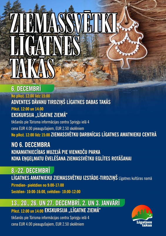 6. decembrī Līgatnes dabas takās no plkst. 12:00 līdz 15:00 notiks Ziemassvētku tirdziņš, kur varēsiet iegādāties amatnieku darinātas dāvaniņas un gardumus svētku galdam. Tāpat Jūs gaidīs A/S „Laima” organizētā saldumu viktorīna. Savukārt Līgatnes Amatnieku centrā Jūs gaidīs Ziemassvētku darbnīcas, kurās varēsiet savām rokām izgatavot dāvaniņas mīļajiem.