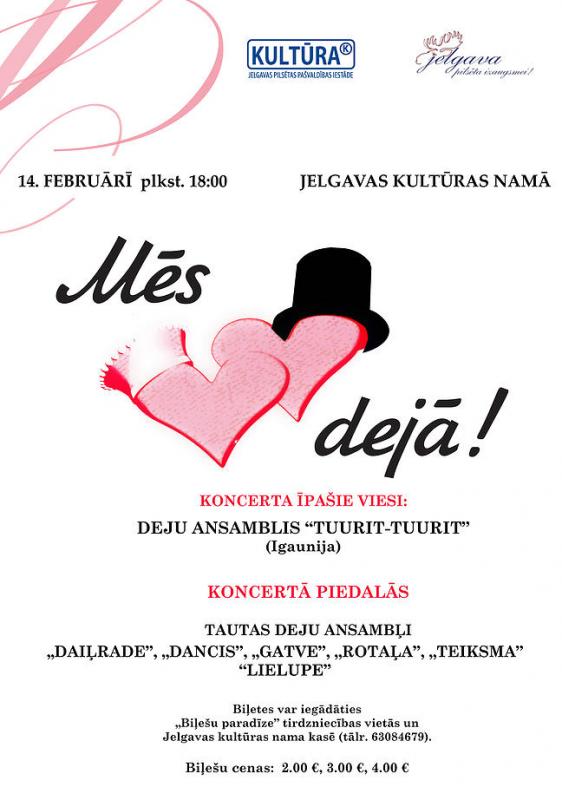 Sestdien, 14. februārī, pulksten 18, Jelgava kultūras namā norisināsies, viena no skaistākajām ziemas tradīcijām - koncerts „Mēs mīlam dejā”. Šogad koncerts, dejotājus un dejas mīļotājus pulcēs tieši Valentīndienas vakarā.