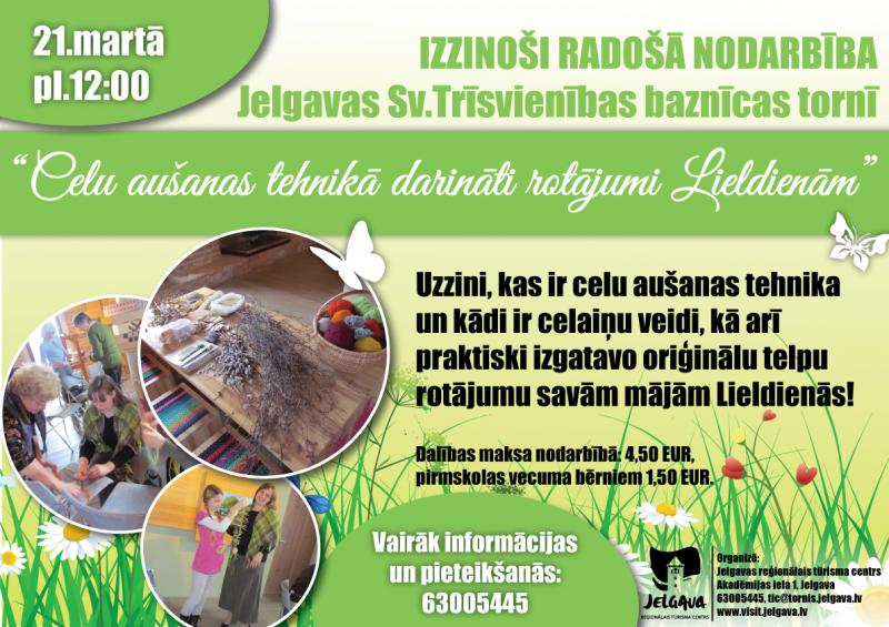 21.martā, pl.12:00, Jelgavas Sv.Trīsvienības baznīcas tornī notiks radošā nodarbība “Celu aušanas tehnikā darināti rotājumi Lieldienām”. Nodarbības dalībniekiem būs iespēja iepazīt latviešu Lieldienu tradīcijas, uzzināt, kas ir celu aušanas tehnika un kādi ir celaiņu veidi, kā arī praktiski izgatavot oriģinālu telpu rotājumu savām mājām Lieldienās.