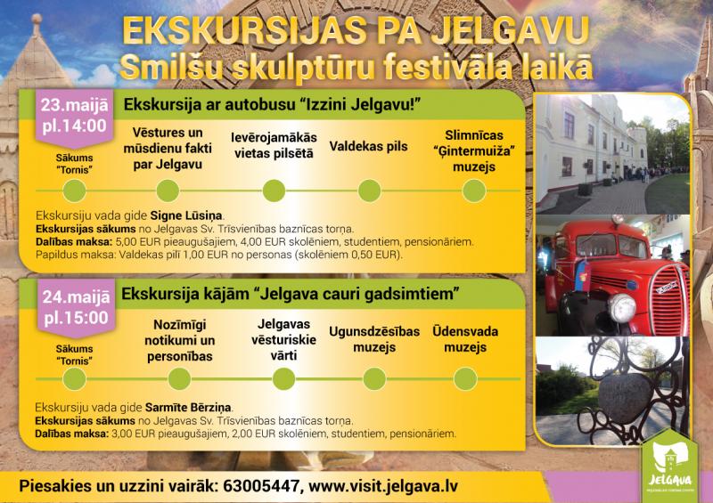 23.un 24.maijā Jelgavā norisināsies 9. Starptautiskais Smilšu skulptūru festivāls. Šajās dienās Jelgavas reģionālais tūrisma centrs piedāvā iepazīt Jelgavas pilsētu ekskursijās vietējā gida pavadībā. Ekskursijās uzzināsiet Jelgavas nozīmīgākos notikumus un atklāsiet stāstus, kas risinājušies pilsētas 750 gadu pastāvēšanas laikā.