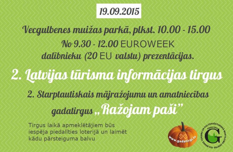 19.septembrī, Gulbenē, Vecgulbenes muižas parka teritorijā no plkst. 10:00 – 15:00 norisināsies 2. Latvijas tūrisma informācijas tirgus, kurā piedalīsies tūrisma informācijas centri no Jelgavas, Raunas, Tukuma, Smiltenes, Dobeles, Kārsavas, Bauskas, Pļaviņām, Līvāniem, Apes un Cesvaines.