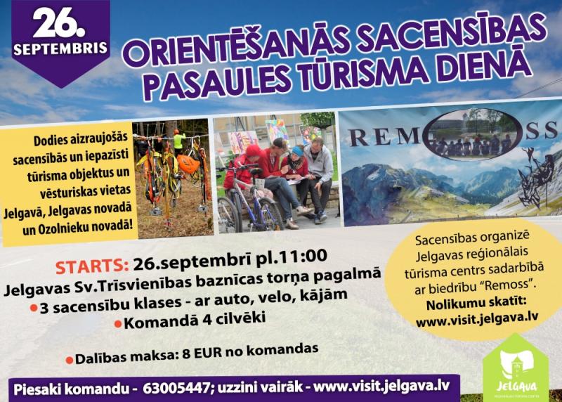 Pasaules tūrisma diena katru gadu starptautiski tiek atzīmēta 27.septembrī. Jelgavā un apkārtnē, atzīmējot šo dienu, 26.septembrī norisināsies orientēšanās sacensības, lai iepazītu apkārtnes ievērojamākos tūrisma objektus un vēsturiskas vietas. Sacensībām ir aicinātas pieteikties komandas četru cilvēku sastāvā, startējot trīs sacensību klasēs – kājām pa Jelgavu, ar velosipēdiem pa Ozolnieku novadu vai ar automašīnām pa Jelgavas novadu. Sacensību laikā katrai komandai būs jāatrod vairāki kontrolpunkti sacensību teritorijā un jāizpilda darba uzdevumu lapa, kas ietvers dažādas ar tūrismu, atpūtu, izziņu un izklaidi saistītas vietas un objektus Jelgavā, Jelgavas novadā un Ozolnieku novadā. Vairākos kontrolpunktos darbosies biedrības “Remoss” pārstāvji, kas iesaistīs komandas aktīvos un sportiskos uzdevumos.