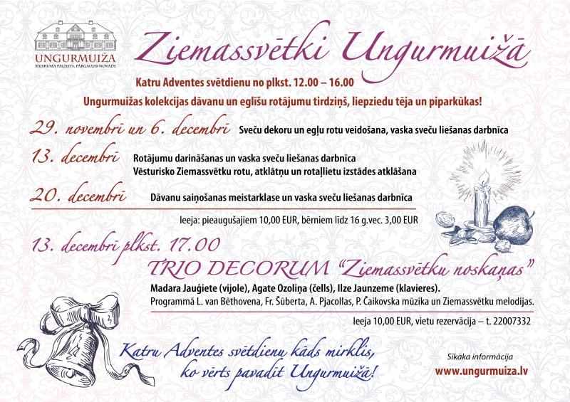Katru Adventes Svētdienu no plkst. 12.00 – 16.00 Ungurmuižā gaidīti lieli un mazi apmeklētāji, lai svētku noskaņās iemācītos ko jaunu un izbaudītu muižas gaisotni.