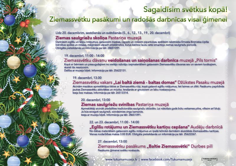 Tuvojas vieni no gada gaidītākajiem un brīnumainākajiem svētkiem – Ziemassvētki. Tukuma muzejs ir parūpējies par Ziemassvētku radošajām darbnīcām un pasākumiem visai ģimenei. Iespēja izveidot Ziemassvētku kartiņas un dāvanas sev, radiem un draugiem, tikties ar Ziemassvētku rūķiem un Rīgas Jauniešu Leļļu teātri „I-ā”, piedalīties Ziemas saulgriežu svinībās latviskās noskaņās.