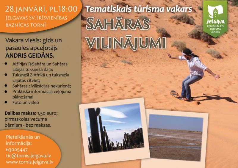 Tematiskais tūrisma vakars “Sahāras vilinājumi” notiks 28.janvārī, pl.18:00, Jelgavas Svētās Trīsvienības baznīcas tornī. Dalības maksa – 1,50 EUR, pirmskolas vecuma bērniem- bezmaksas. Pieteikšanās pa tālruni 63005447 vai e-pastu tic@tornis.jelgava.lv.