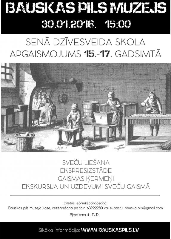 Bauskas pils muzejā 30.janvārī plkst. 15:00, senā dzīvesveida skolas ietvaros, notiks pasākums „Apgaismojums 15.-17.gadsimtā”. Apmeklētājiem būs iespēja iepazīties ar renesanses un manierisma periodam raksturīgiem gaismas ķermeņu veidiem, kā arī vienas dienas ekspresizstādē apskatīt Bauskas pils arheoloģiskajos izrakumos atrastu gaismekļu fragmentus un senus gaismas ķermeņus no citu muzeju krājumiem.