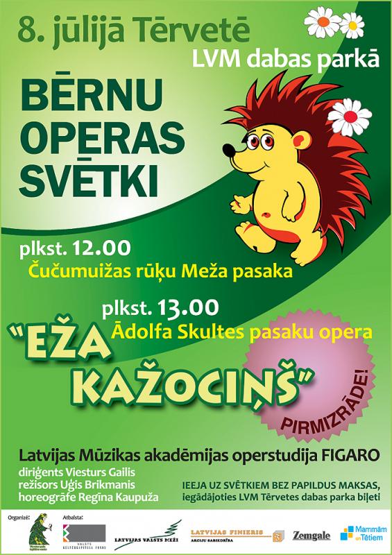 Jau ceturto gadu LVM dabas parkā Tērvetē norisināsies Bērnu operas svētki. Šogad, 8. jūlijā, plkst 12:00 svētkus ieskandēs tautā iemīļotie Čučumuižas rūķi ar koncertuzvedumu “Meža pasaka”, savukārt plkst 13.00 savu pirmizrādi piedzīvos Ādolfa Skultes pasaku opera bērniem “Eža kažociņš”, kura komponēta tālajā 1979.gadā. Opera komponēta pēc Artūra Birnsona libreta, par pamatu ņemot Viļa Plūdoņa 1921. gadā poēmas formā rakstīto pasaku. Operas sižetā, salīdzinājumā ar Viļa Plūdoņa pasaku, spilgtāk un plašāk veidota cīņa starp labo un ļauno. Te pretnostatās Ezītis ar saviem draugiem dzīvniekiem – Zaķi, Vāveri, Stirnu, Lāci un suni Čapu, un Ļaunais burvis ar saviem kalpiem – Mošķi, Nagažu, Spīganu un diviem Tīģeriem. Pārējie tēli – Eža tēvs un māte, karalis ar trim meitām, ņemti no Viļa Plūdoņa poēmas.