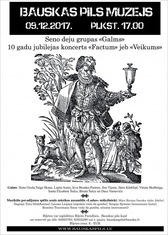9. decembrī plkst. 17:00 Bauskas pils seno deju grupa “Galms” kopā ar senās mūzikas ansambli “Ludus” sniegs 10 gadu jubilejas koncertu “Factum” jeb “Veikums”. Koncertā apkopotas 12 spilgtākās dejas no dažādām koncertprogrammām, kas veidos simbolisku stāstu par 10 gadu garumā paveikto.