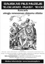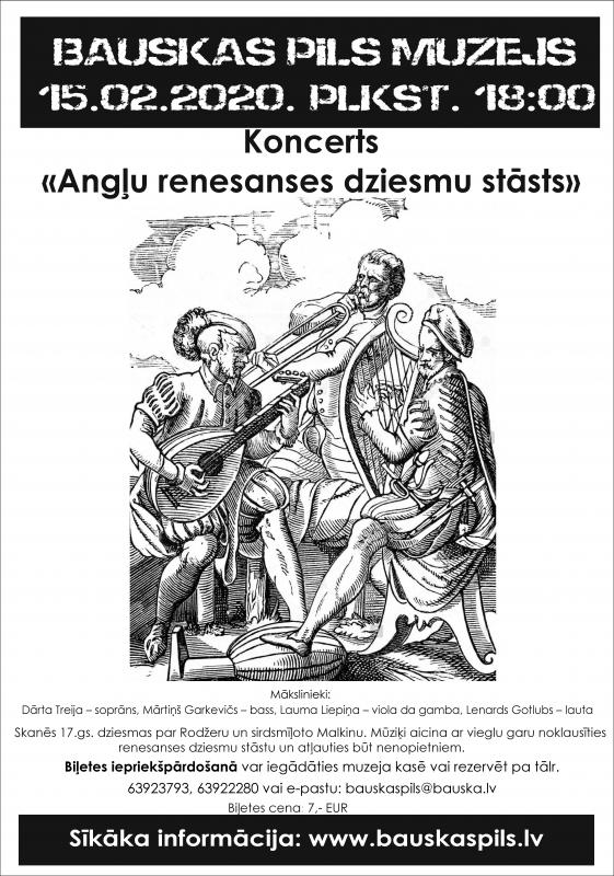 15. februārī plkst. 18:00 Bauskas pilī skanēs “Angļu renesanses dziesmu stāsts“. Koncertā skanēs dziesmas par Rodžeru un sirdsmīļoto Malkinu, kas atrodamas 1614. gadā izdotajā mūzikas teorijas traktātā. Mūziķi- Dārta Treija – soprāns, Mārtiņš Garkevičs – bass, Lauma Liepiņa – viola da gamba, Lenards Gotlubs – lauta aicina ar vieglu garu noklausīties muzikālo stāstu un atļauties būt nenopietniem.